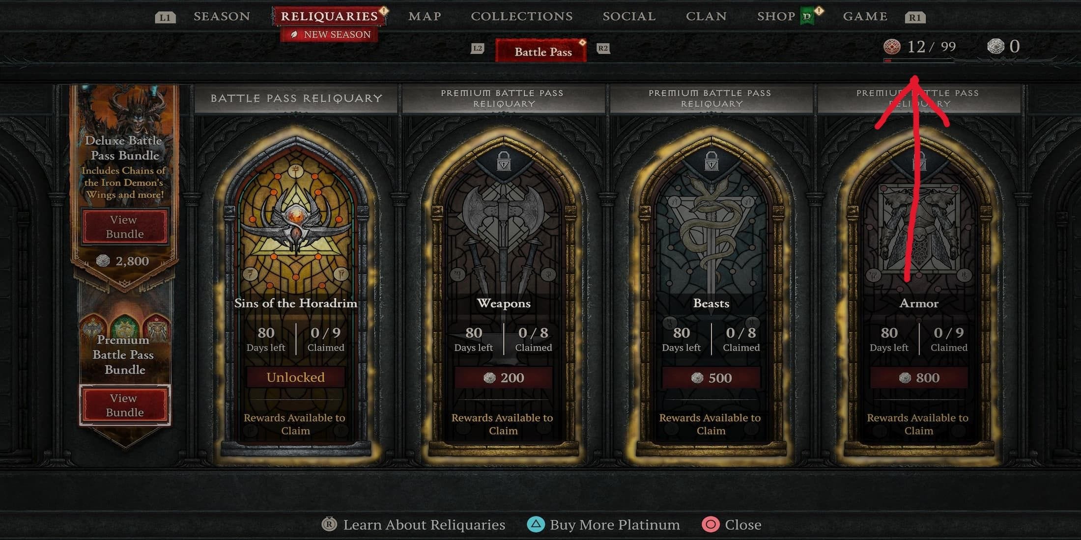 Os Relicários são, basicamente, categorias de recompensas cosméticas. Cada um reúne um conjunto específico de itens, como armas, armaduras ou mascotes, e pode ser gratuito ou pago com Platinum.