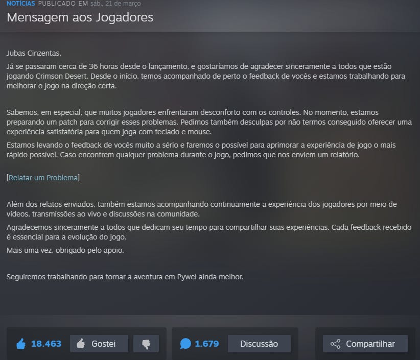Enquanto outras gigantes do mercado ignoram os jogadores ou lançam jogos quebrados e desaparecem, a PA está lá, na linha de frente, corrigindo bugs em tempo recorde e entregando melhorias que a gente nem sabia que precisava. Crimson Desert é a prova de que eles realmente se importam com o produto final.