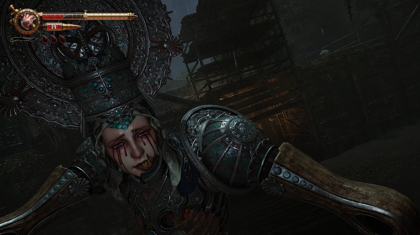 Porém, mesmo com elementos característicos do gênero, o jogo consegue converter tudo isso em originalidade. As armas de Crisol, por exemplo, ganham uma roupagem única graças ao uso de sangue como munição, com um processo de recarga que é quase doloroso, em que você precisa segurar o botão e ver a vida sendo sugada de Gabriel.