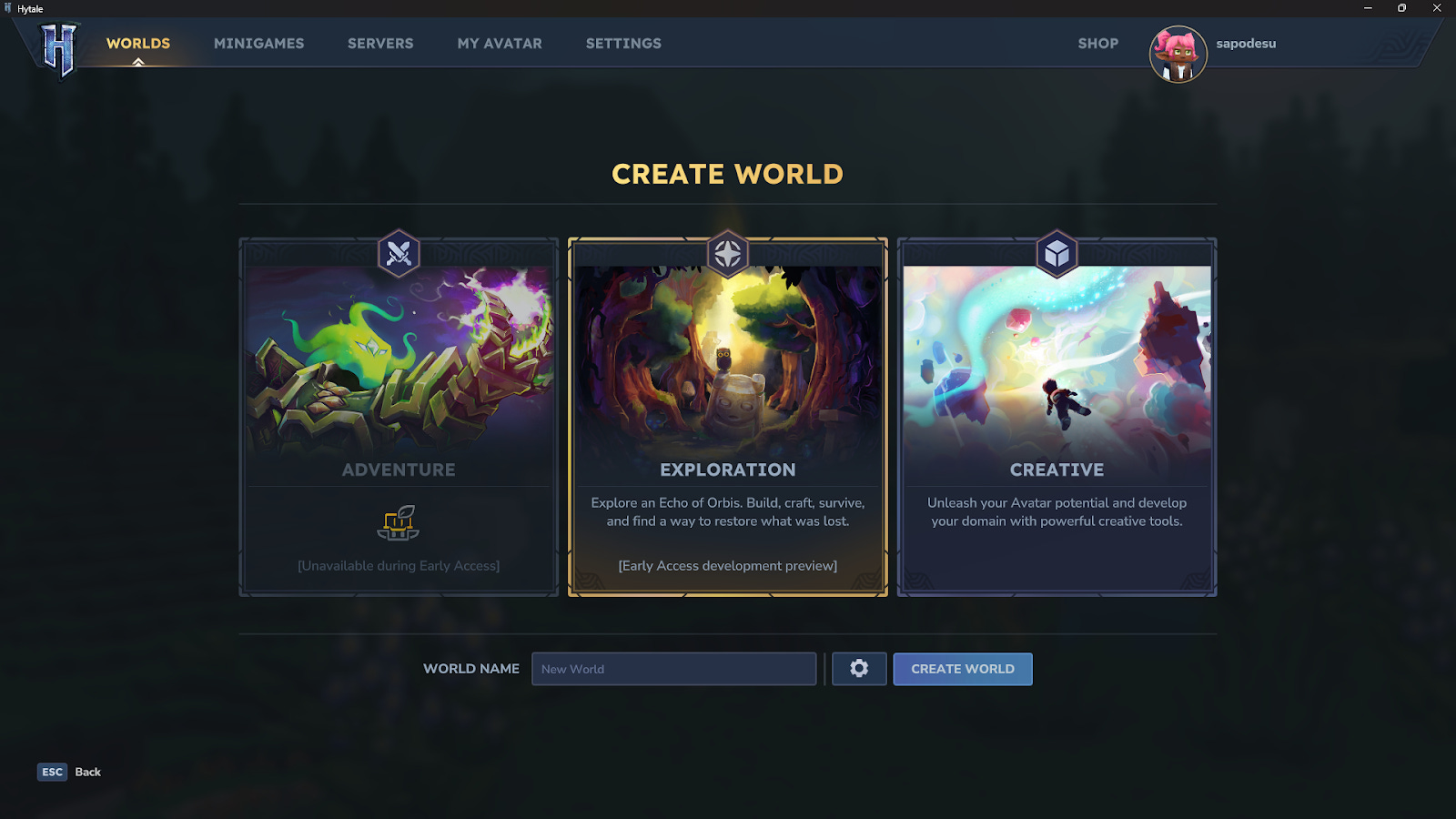 A criação de mundos conta com três opções principais: