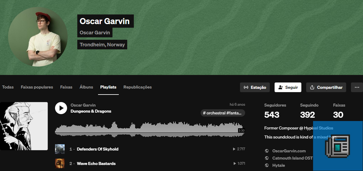 Dei uma pesquisada rápida e descobri que o compositor da trilha sonora do jogo, Oscar Garvin, não compôs músicas para outros jogos - pelo menos nenhum que conhecemos - e que dedicou quase 10 anos (de 2016 a 2025) à criação da vasta trilha sonora de Hytale.