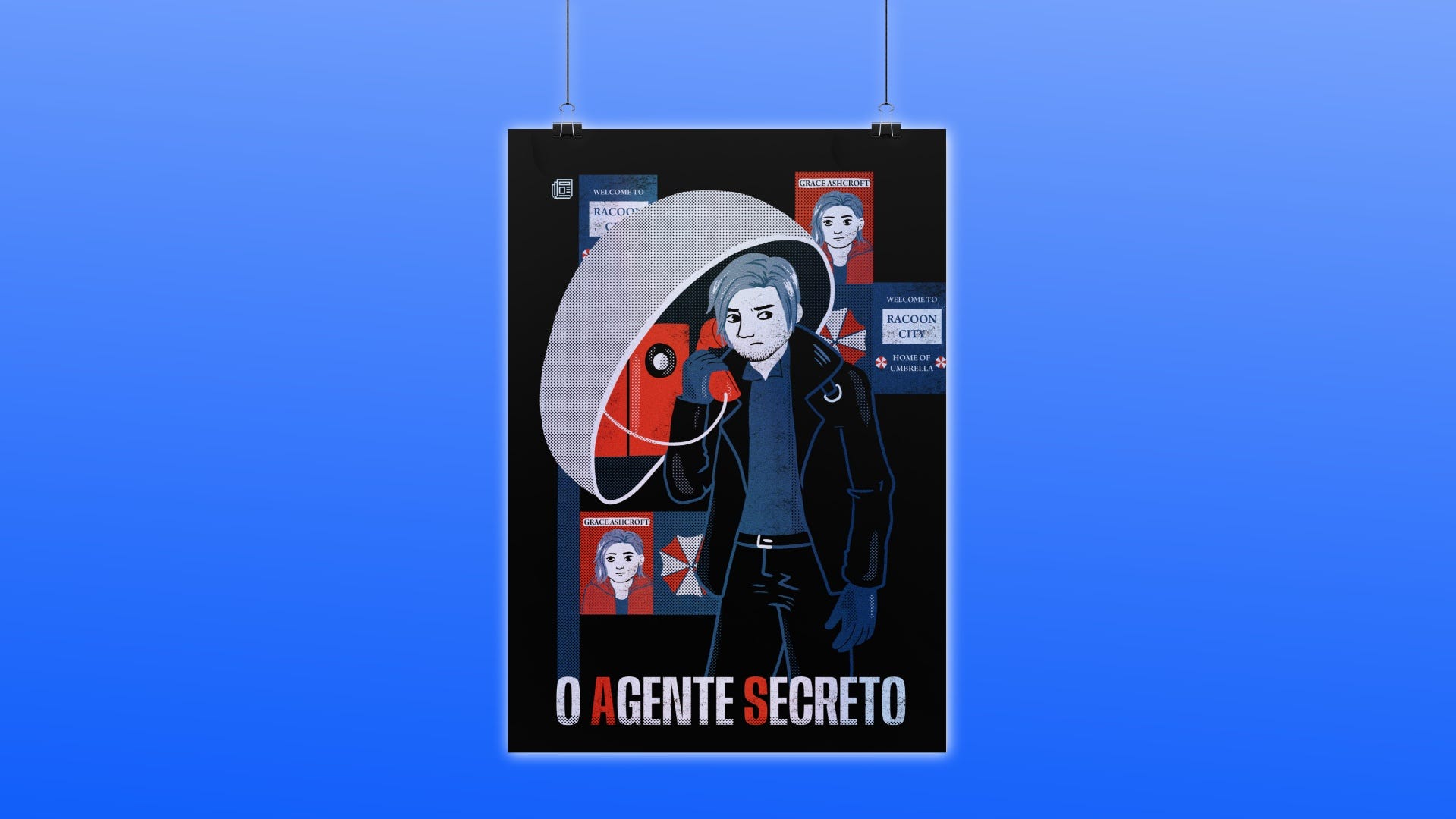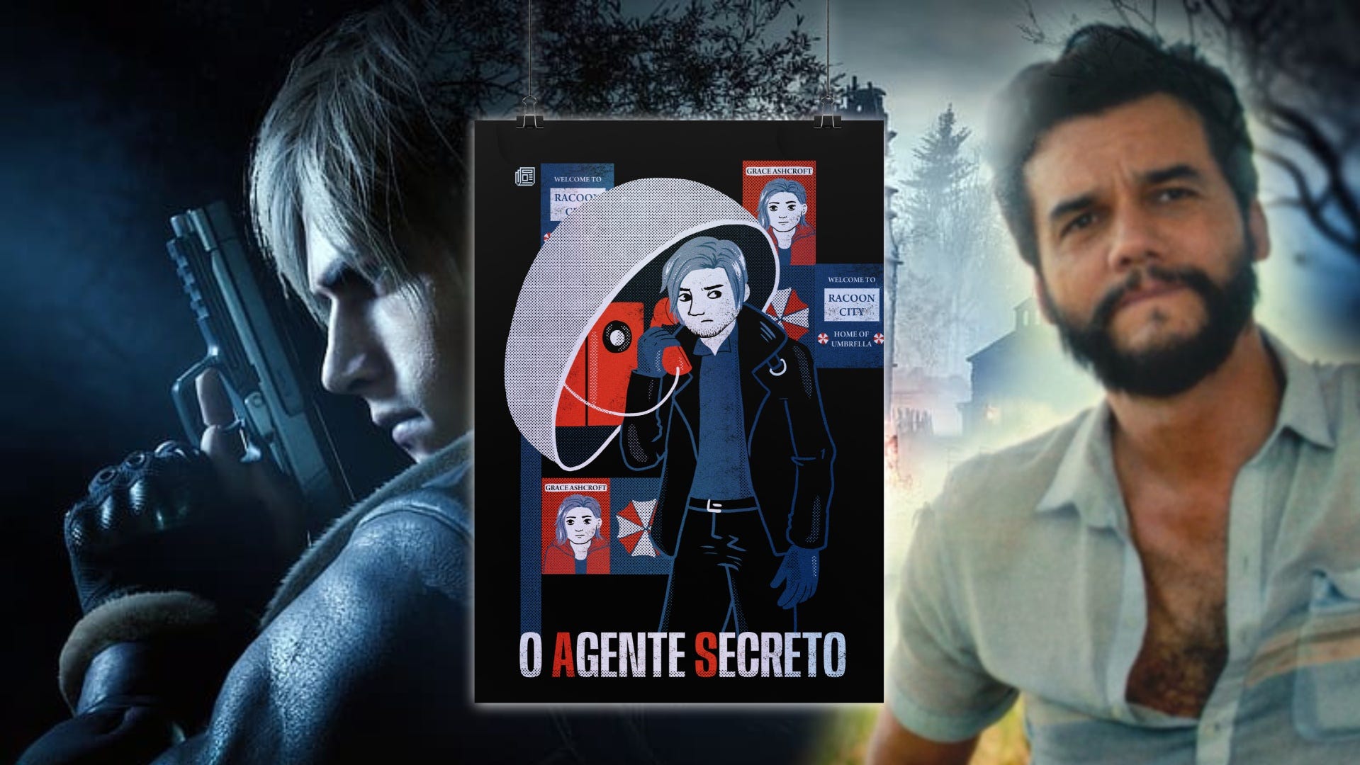 Na arte, Leon Kennedy assume o lugar de Wagner Moura na composição principal do pôster de O Agente Secreto. O personagem aparece em um orelhão, cercado por aquela atmosfera de conspiração e perigo iminente.