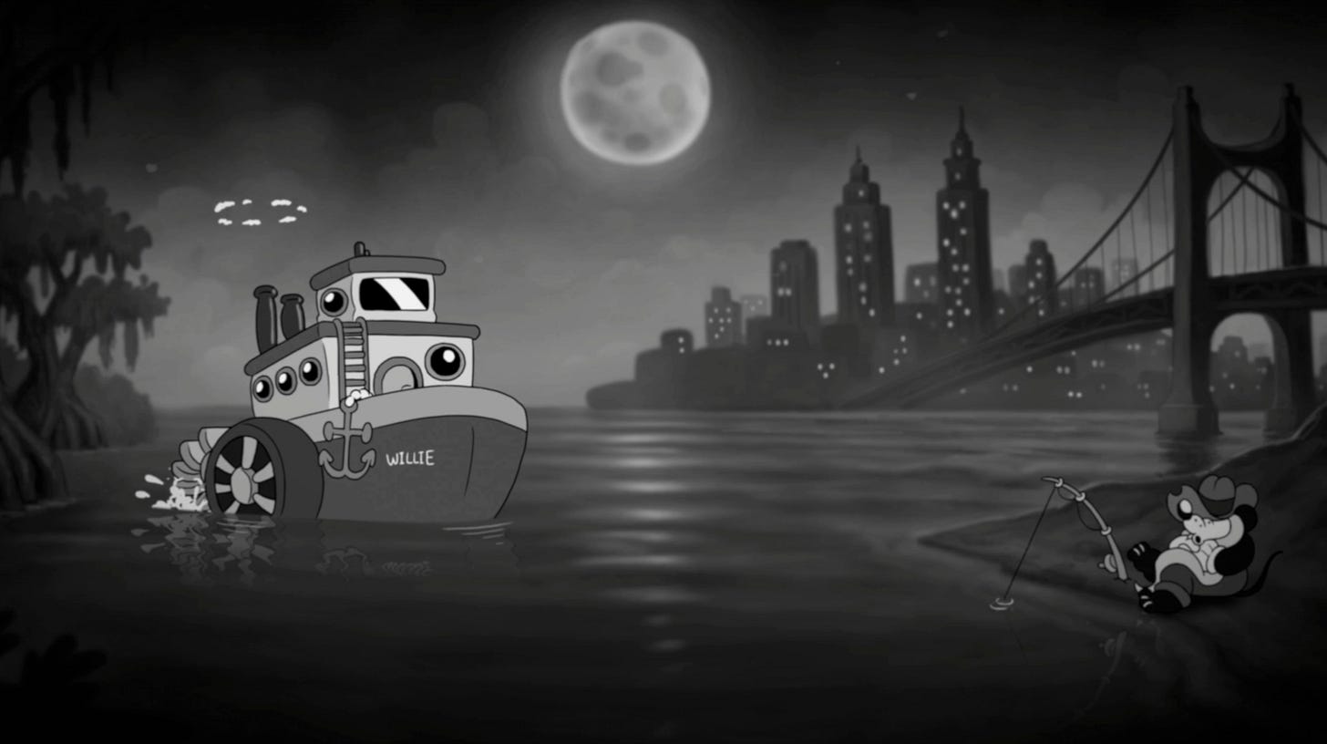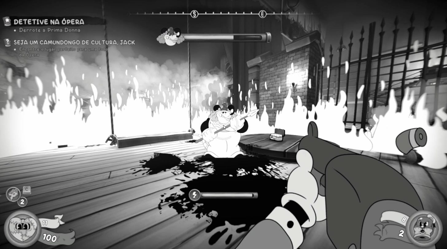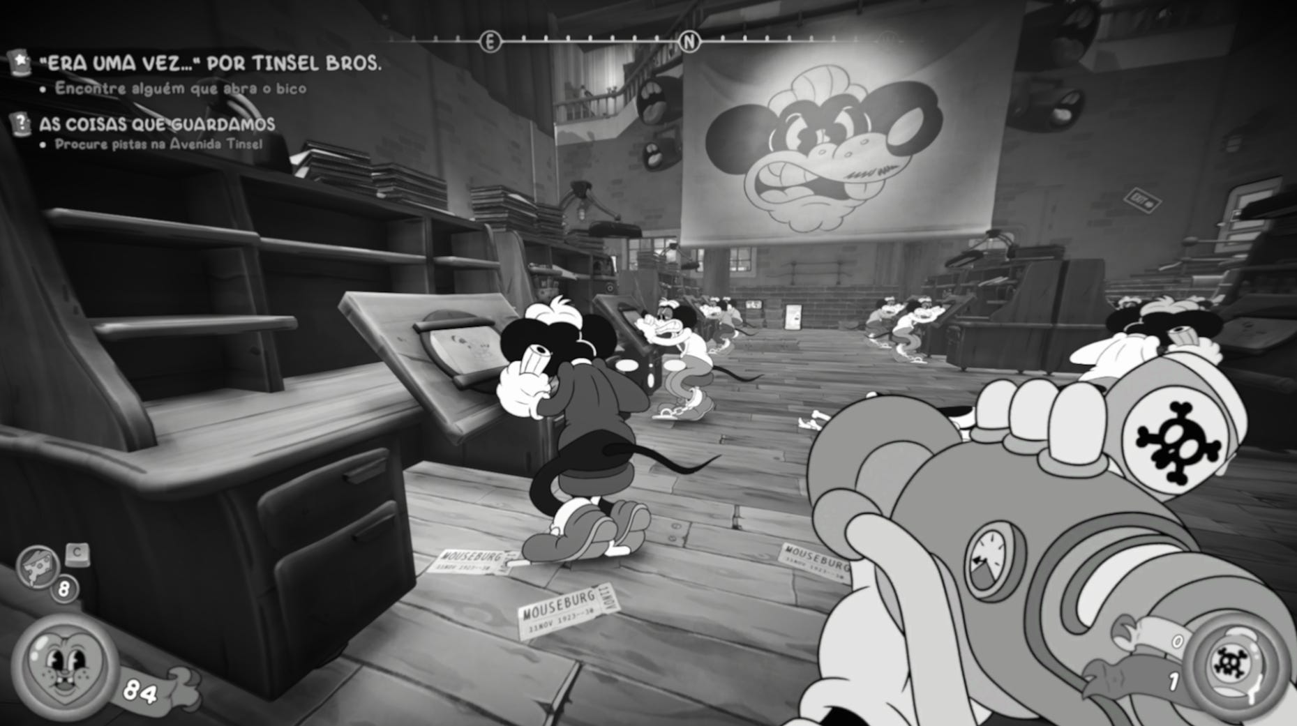 Se existe um aspecto em que MOUSE: P.I. For Hire não apenas acerta, mas se destaca com folga, é na sua direção de arte. O jogo abraça completamente a estética dos desenhos animados da década de 1930, com animações feitas quadro a quadro e um visual em preto e branco que vai muito além de um simples filtro estilístico.