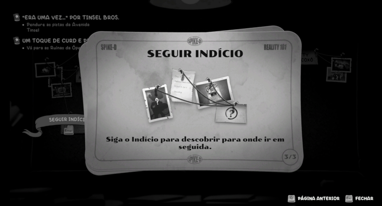 O uso de um quadro de investigação, onde organizamos evidências para avançar na história, ajuda a reforçar essa sensação de estar realmente montando um quebra-cabeça, ainda que seja uma mecânica relativamente simples dentro do conjunto.