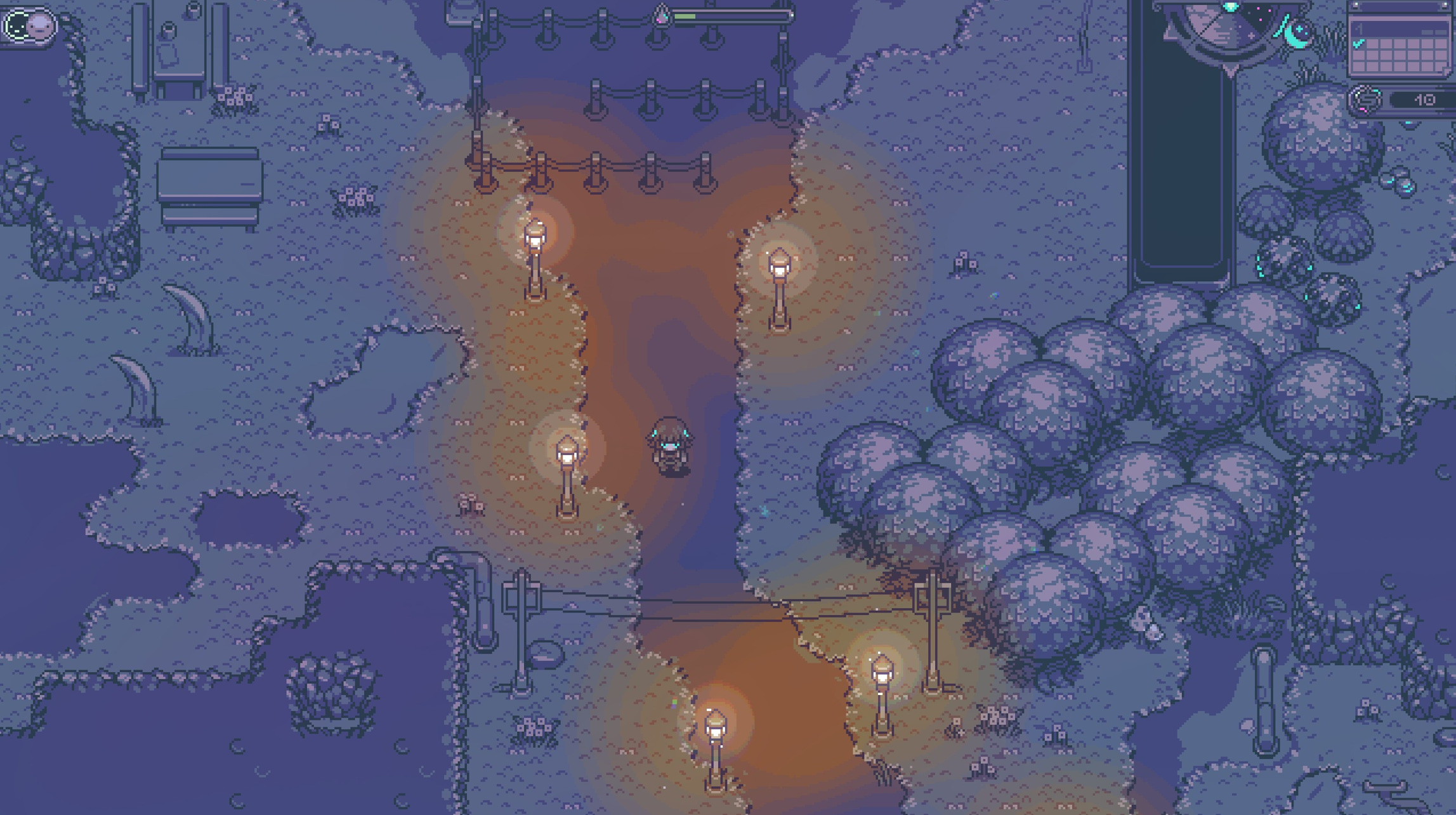 Esse equilíbrio não é apenas estético. Ele influencia diretamente o ritmo da experiência, já que o tempo é dividido em três períodos: manhã, tarde e noite. O jogador escolhe quando avançar, o que dá um controle interessante sobre o andamento da narrativa (e sobre quando enfrentar coisas… estranhas).
