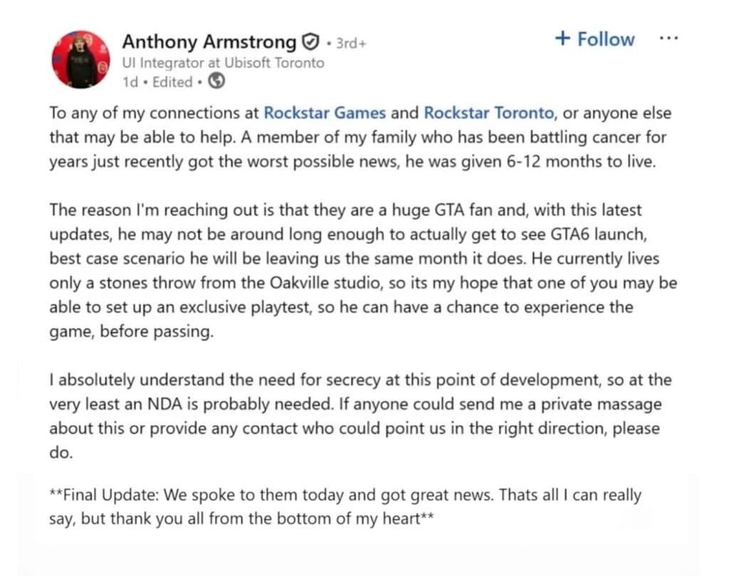 Algumas semanas depois, Armstrong atualizou o post com uma informação importante: o CEO da Take-Two Interactive, empresa que controla a Rockstar, havia entrado em contato. Pouco depois, veio uma última atualização ainda mais intrigante, afirmando que ele havia recebido “ótimas notícias”, mas que não poderia dar mais detalhes.